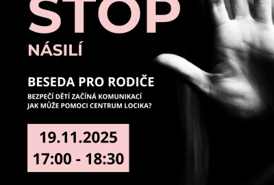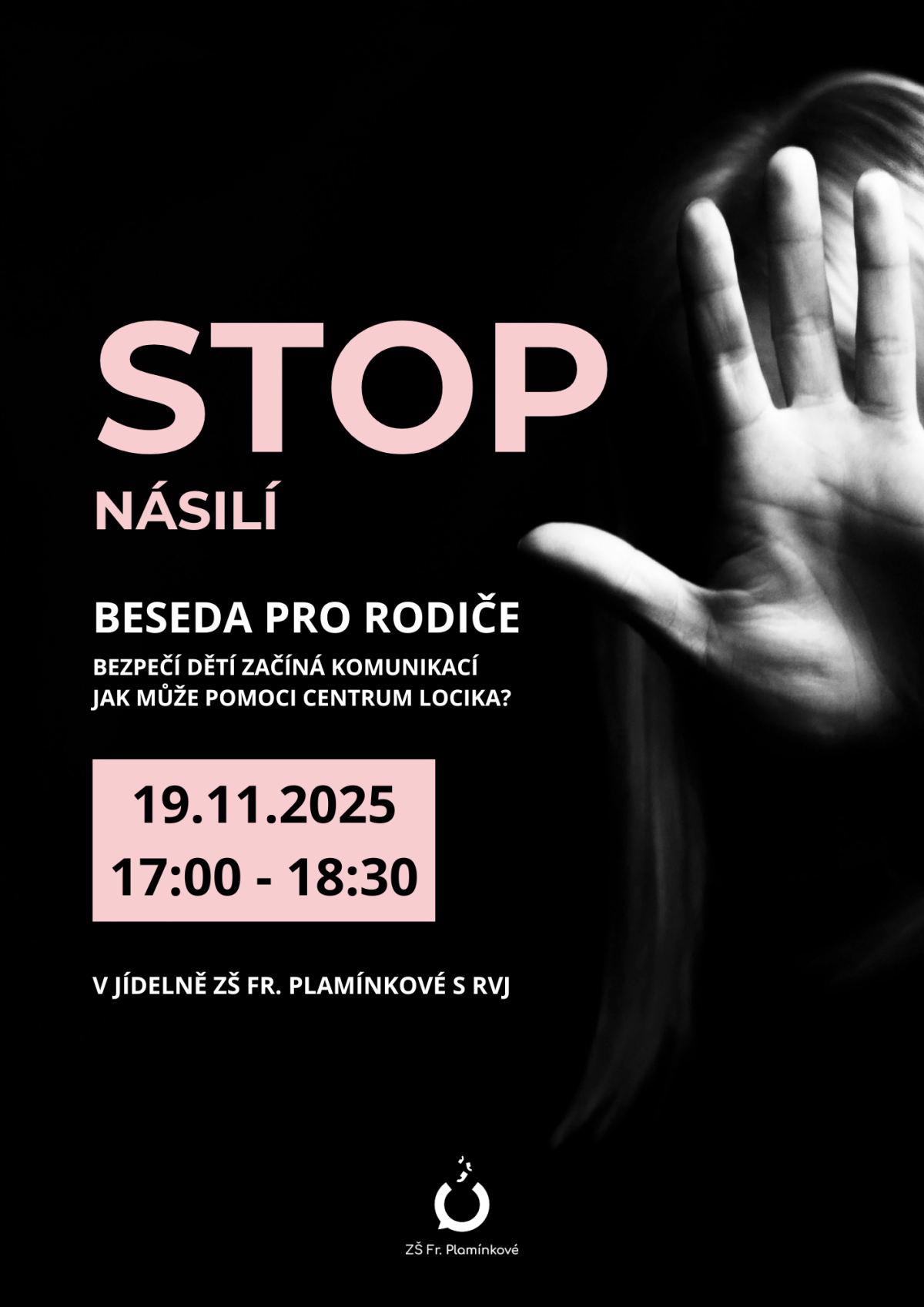 Od 17:00 se v prostorách školní jídelny uskuteční pro rodiče přednáška "Stop násilí", kterou pořádá centrum Locika.